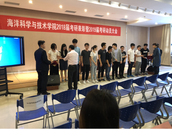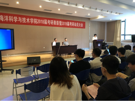 2018届考研表彰暨2019届考研动员大会在杨存国二号报告厅隆重召开,出席本次会议的有学院党委书记穆军教授、学院党委副书记刘松平副教授、学工办辅导员楼林燕、庄亿窈、班主任代表胡海燕老师以及海科学院各班学生代表,楼林燕老师主持会议。