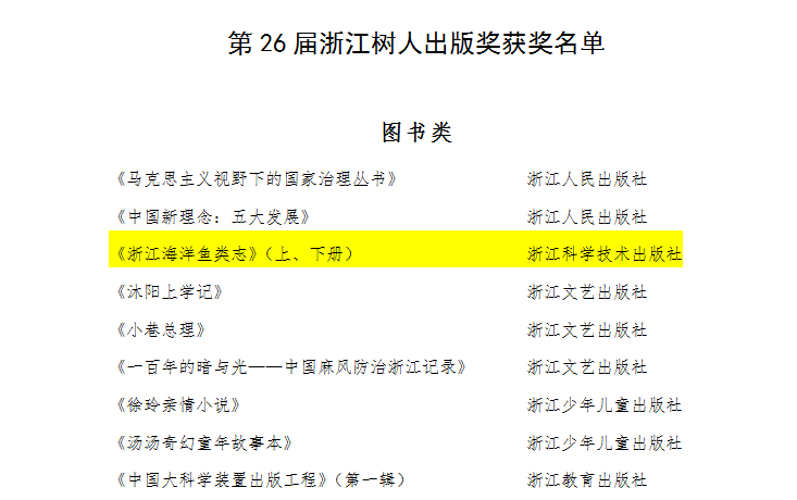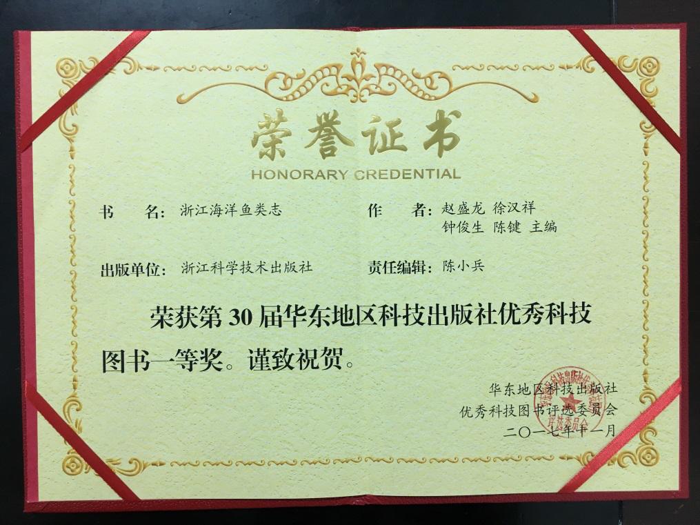 赵盛龙教授主编的《浙江海洋鱼类志》一书,在众多参评出版物中,摘获第30届华东地区科技出版社优秀科技图书一等奖,及第26届浙江树人出版奖正式奖。