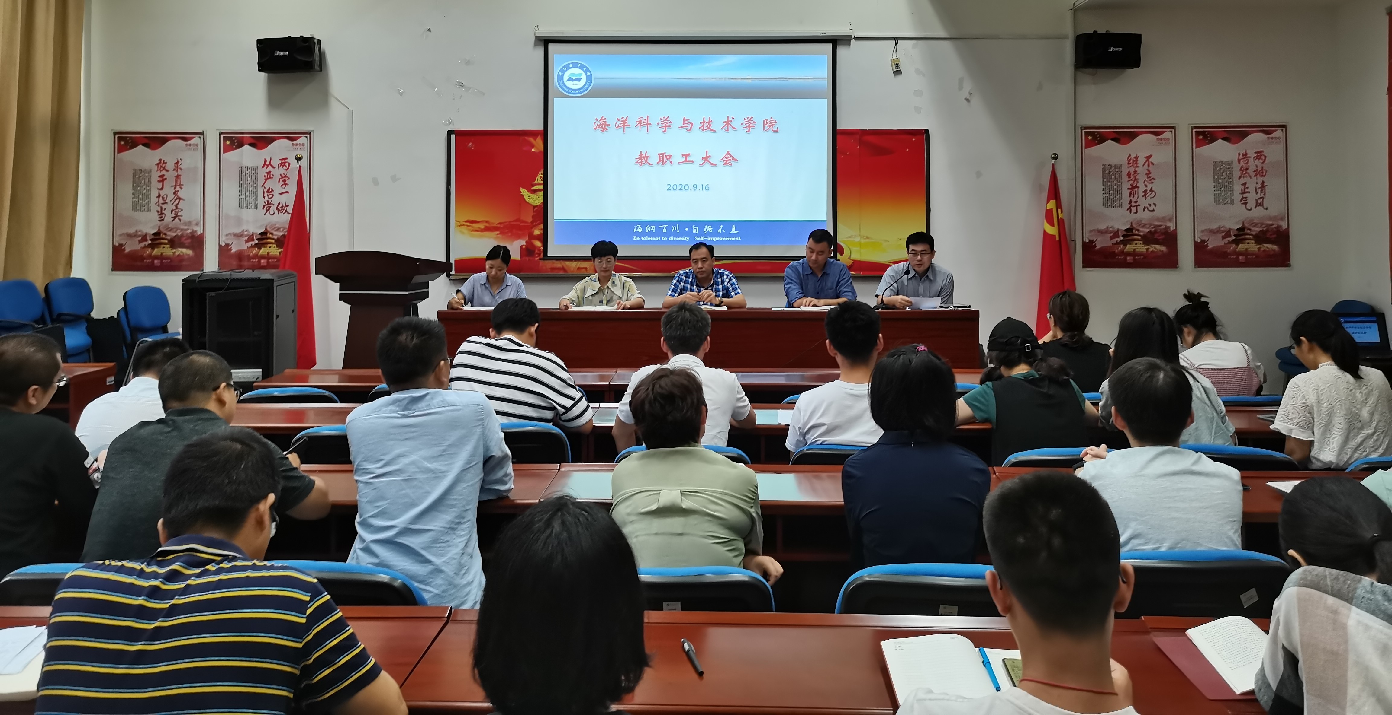 在海科楼141会议室召开2020—2021学年第一学期初教职工大会。学院党委书记、院长王健鑫,副院长王天明,党委副书记、纪委书记何桂明,院长助理桂峰,院长助理李博及全体教职工参加会议。会议由王健鑫院长主持。