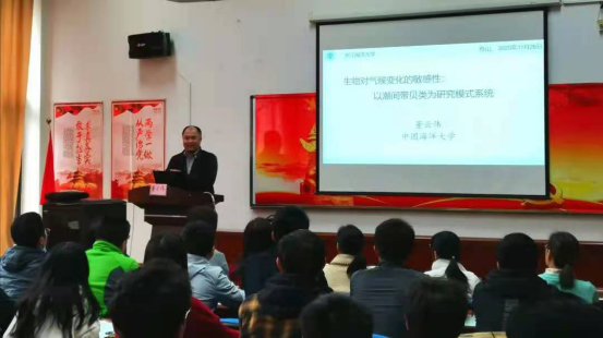 2020年11月26号下午,“东海学术论坛”第六期在海科楼141学术报告厅如期举行。中国海洋大学董云伟教授应邀作了题为《潮间带贝类对气候变化敏感性》的学术报告。报告由王健鑫院长主持。