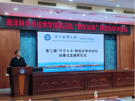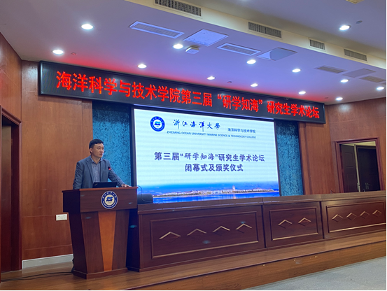 闭幕式上,王天明副院长宣布本次论坛获奖名单,学校王健鑫副校长、研究生院王迎宾院长、海科学院吕振明教授和廖智教授为获奖学生颁奖。陆璐瑶同学做研究生代表发言、徐兴涛教授做导师代表发言。最后,王迎宾院长和王健鑫副校长分别做总结发言和致辞,王迎宾院长肯定了海科学院研究生论坛的举办为学校研究生教育高质量培养树立一面旗帜,王健鑫副校长对所有研究生同学在学术研究、为人做事方面提出了要求和建议,他希望同学们要踏实科研,对学术保有敬畏心,对人要有感恩之心,对事要有责任之心,共同创造良好的学术氛围。