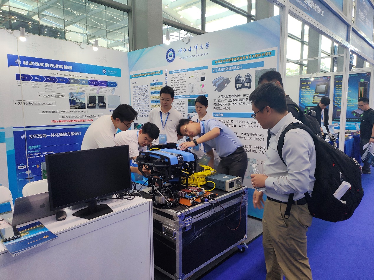 学院科研团队师生通过实物演示、多媒体播放等形式向参观者展出了学校在“东海渔业资源重建智能装备”、“水下声学监测机器人”等领域的创新研发成果。期间,更与多家企业和高校进行了深入交流,深入讨论了上述研发成果在落地转化中的潜力,为未来的科研合作、项目成果转化和技术创新奠定了坚实基础。