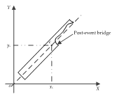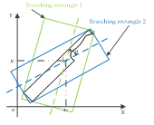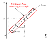 图1水上桥梁特征知识表达示意图 (a)灾后水上桥梁 (b)搜索矩形 (c)最小外接矩形