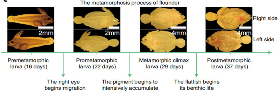 比目鱼为硬骨鱼纲鲽形目种类,是迄今发现的地球上体型最为独特的鱼类之一。在漫长的底栖适应过程中,比目鱼类逐步演化出了扁平且不对称的体型结构,扁平体轴使其更容易将其侧扁的身体埋栖于一薄层泥沙之下(仅使眼睛露出)而躲避敌害;而不对称体型(如眼睛偏转至脑颅同侧)则赋予了鲽形目鱼类埋栖时的双视野,从而使其更容易定位和捕食猎物而获得生存竞争优势;而更奇特的是比目鱼的鳍也发生了明显改变,使其可通过长而有力的背鳍、臀鳍和短而强壮的胸鳍协调运动形成“鳍足”以全新的脊椎动物步伐在海底“行走”;并在其休息时依靠其强壮的胸鳍将身体微微撑起,以更敏锐的视角观察周围的猎物和敌害,可以说从进化角度讲,鲽形目鱼类可能代表了硬骨鱼类底栖环境适应性进化的典型和极致。然而如此独特的鲽形目鱼类是如何起源的?其通过何种机制逐步进化出如此独特的体轴特征的?多年来一直存在争论。部分关键体征(如不对称的眼)从传统的进化论角度是如此难以诠释,以致于在历史上常常被进化论批评者作为反驳达尔文“自然选择学说”的强有利基石(见达尔文《物种的起源》第六版),因而在此背景下全面阐明鲽形目鱼类起源及其独特体轴形成机制具有独特的学术价值。