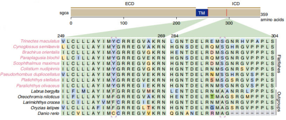 图2.比目鱼中部分基因的变异及其在扁平体轴发育中的可能作用机制