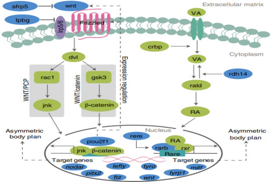 图3. 比目鱼中部分基因的变异及其在不对称体轴发育中的可能作用机制