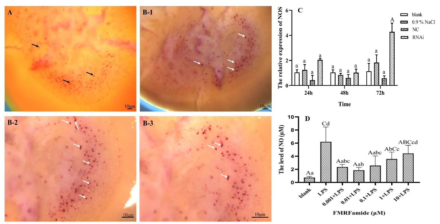 海洋生物种质发掘利用团队选择我国东海海域的特色种曼氏无针乌贼(头足纲、乌贼目、乌贼科、无针乌贼属)为研究对象,从组织解剖学、分子生物学和细胞生物学水平利用双色原位杂交、RNA干扰等多项技术研究了神经肽类激素Phe-Met-Arg-Phe-NH2(FMRFamide)和一氧化氮合酶(NOS)的互作关系,间接反映FMRFamide对内源性NO产生的调控效应,因为NOS是内源性NO产生途径中的必需催化酶,而气体信号分子NO是调控机体多种生理过程的明星分子。体内、体外实验交叉表明正常生理及炎症状态下FMRFamide均能够抑制NO的产生来维持机体内稳态。