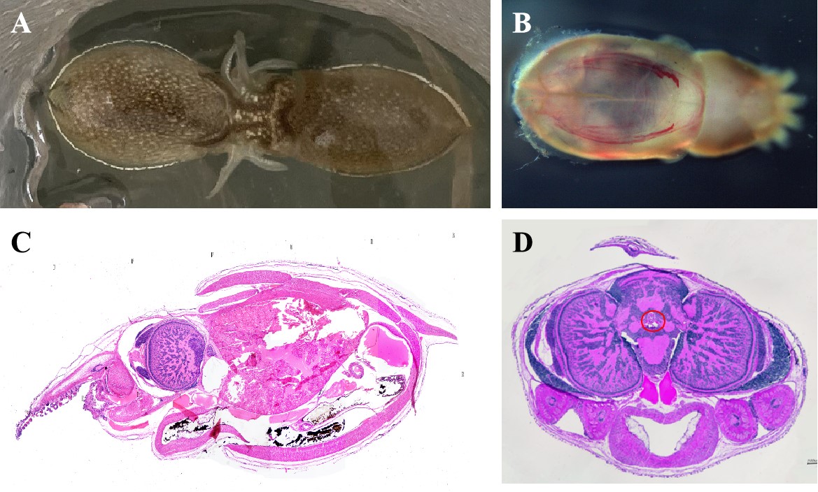 A:正在交配的曼氏无针乌贼,B:FMRFamide前体的胚胎定位,C:曼氏无针乌贼的横切HE染色图,D:曼氏无针乌贼脑部纵切HE染色图。