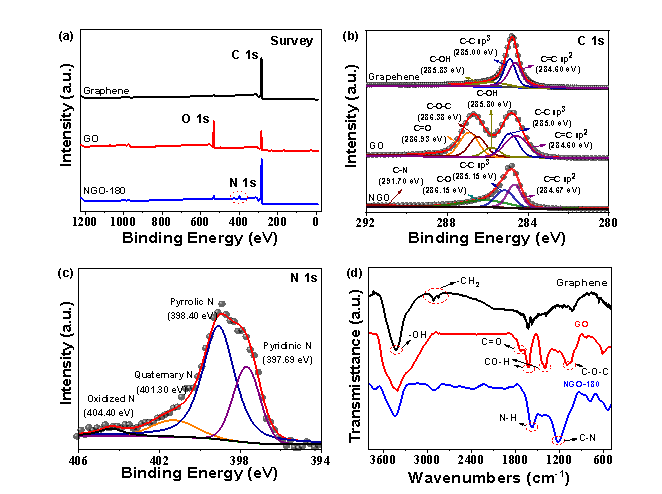 Fig.1 (a)石墨烯、氧化石墨烯和掺氮石墨烯的XPS光谱和(b) C 1s XPS光谱;(c) N掺杂石墨烯的N 1s XPS谱;(d)石墨烯、氧化石墨烯和掺氮石墨烯的FTIR光谱