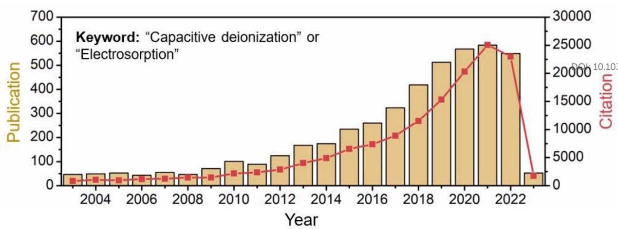 图1、Web-of-Science中过去20年使用关键词“capacitive deionization”或“electrosportion”的出版物和引文记录(截至2023年2月)。