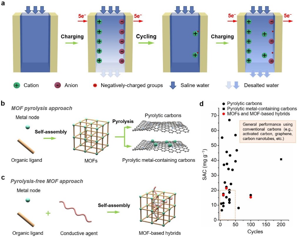 图2、CDI的主要局限性和使用MOF衍生物的解决方案。a,在CDI长期循环过程中常规碳材料性能劣化原因。b-c,MOF衍生物合成路线,其中b)是制备碳和含金属碳的MOF热解方法,c)是使用导电剂制备MOF基杂化物的无热解方法。d,使用MOF衍生物提高CDI性能的数据统计。