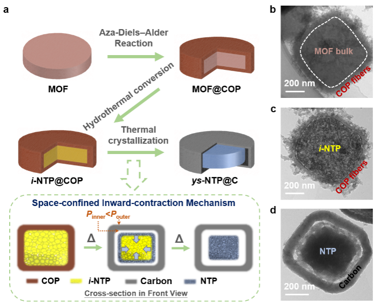图3、碳包NaTi2(PO4)3材料蛋壳结构的设计。a,设计示意图。b-d,对应转换阶段的材料透射电子图像。