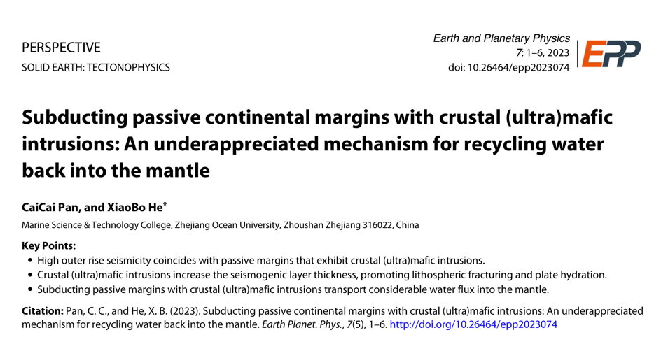 海洋科学专业本科生潘偲偲在教师何小波指导下完成的本科毕业设计工作,在期刊《Earth and Planetary Physics》上发表。论文题目为:Subducting passive continental margins with crustal (ultra) mafic intrusions: An underappreciated mechanism for recycling water back into the mantle (//doi.org/10.26464/epp2023074)。