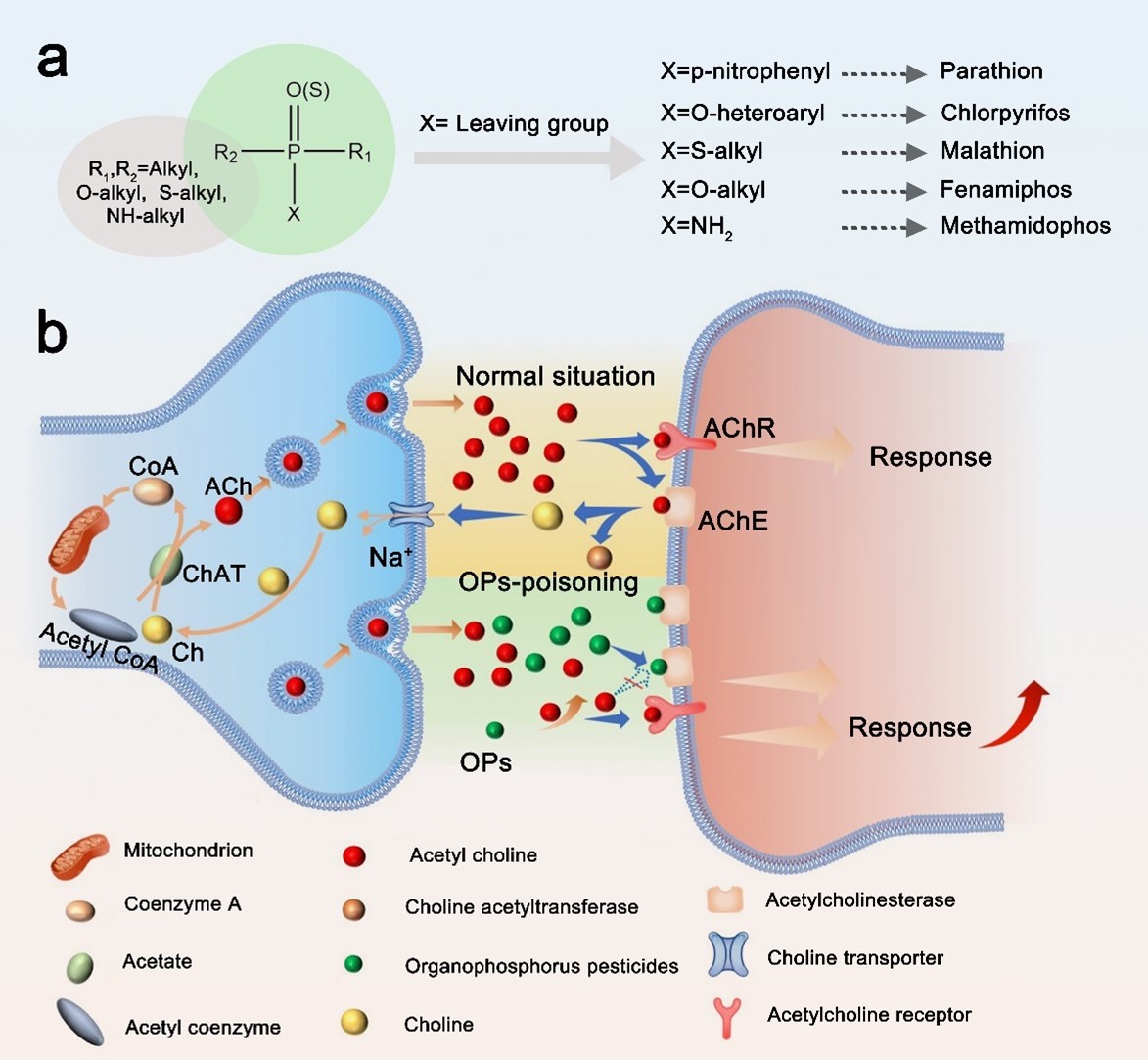图1、(a)有机磷农药的基本结构;(b)有机磷农药的中毒机理。