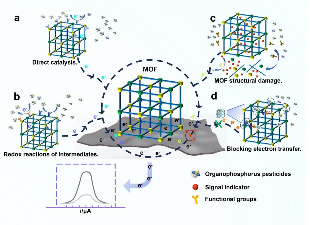 图2、用于电化学检测 OPs 的几种方案:(a)引入催化OPs发生氧化还原反应的活性物质;(b) 活性物质的引入促进 OPs分解,同时活性物质进一步催化中间产物发生氧化还原反应;(c) MOF封装信号标签,当OPs发生反应时,检测体系环境改变,导致 MOF 的解体和信号标签的释放;(d) OPs 与 MOF(复合材料)上的某些组分形成强的配位相互作用,阻碍电子转移。