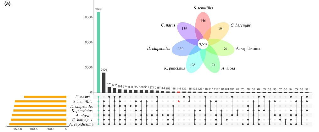 刘炳舰等近期在分子生态领域顶级期刊《MolecularEcology》发表题为“Chromosome-level genome assembly and population genomicanalysis reveal evolution and local adaptation in commonhairfin anchovy (Setipinna tenuifilis)”的研究论文,首次成功破译了黄鲫的全基因组序列,构建了首个黄鲫高质量染色体图谱,揭示了黄鲫基因组适应性演化的特点;通过群体遗传学分析区分了中国沿海地区三个不同的黄鲫遗传分支;明确了环境因子特别是温度对黄鲫遗传变异空间模式的驱动作用。