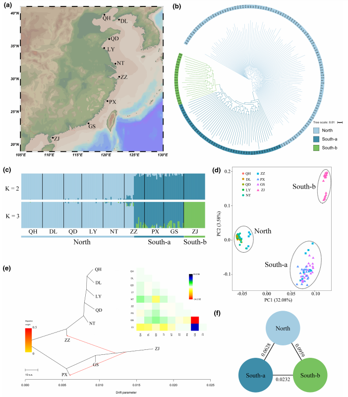 图三、黄鲫的采样站位、种群遗传结构、基因流及动态历史分析结果