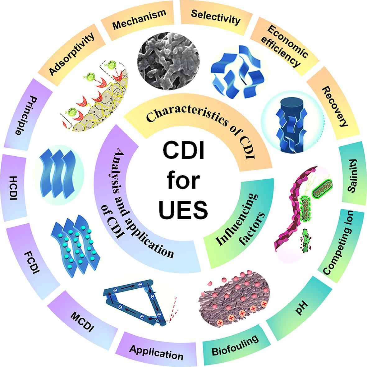 铀是核工业不可或缺的资源,而陆基铀矿资源含量有限且分布不均。因此,从海水中提取铀(UES)对可持续能源生产具有巨大潜力。电容去离子(CDI)技术以其低能耗、工艺简单、对环境友好和高吸附效率而闻名,对UES具有重要的应用潜力。然而,该技术并未在UES方向上的得到广泛应用。研究团队综述了CDI技术的发展史、原理、分类以及应用,重点介绍了CDI技术在UES方向上的研究现状及其优势,并对该技术在提铀过程中存在的影响因素(竞争离子、盐度、pH、生物污损)进行了讨论,旨在探讨使用CDI技术进行UES的可行性和经济效益,并为进一步优化和推广CDI技术在UES中的应用提供理论支持(图1)。此外,研究团队还致力于通过引入材料信息学来解决CDI在铀提取中现存的挑战,并做出展望。研究团队为CDI技术在UES中的发展和工业进展提供了实用的见解,该研究成果有助于CDI技术在海水资源绿色利用中发挥至关重要的作用。