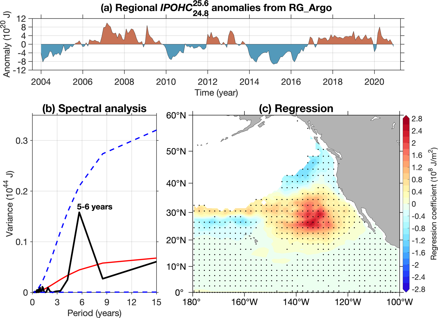 图1.副热带东北太平洋24.8–25.6 kg/m3位密层内的等密层海洋热含量()的年际变化特征。(a)2004至2020年研究区域逐月异常的时间序列。(b)研究区域异常的功率谱分析。(c)将东北太平洋异常回归到标准化后的研究区域异常时间序列(指数)的回归结果。