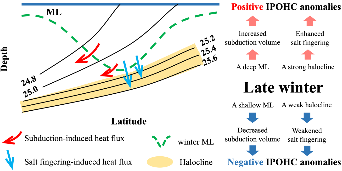 研究发现,晚冬的潜沉(subduction)和盐指(salt fingering)是引起该等密层海洋热含量年际变化的关键过程(图2)。具体而言,潜沉体积增加和盐指增强会引起等密层海洋热含量正异常,而相反的过程将导致等密层海洋热含量负异常。分别来源于混合层深度变率和盐跃层强度变率的晚冬潜沉体积变化和盐指强度变化共同作用,最终带来了观测到的等密层海洋热含量年际异常。研究强调潜沉引起的等密层海洋热含量异常是由潜沉体积决定的,而并非混合层温度。研究还指出,盐指在引起更深的、通风不良的盐跃层/温跃层内大量等密层海洋热含量异常中扮演着至关重要的作用。