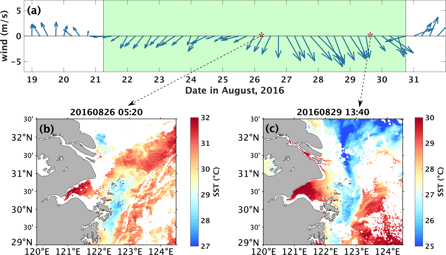 图1.(a) 2016年8月19日至31日研究海域区域平均的风矢量时间序列。(b)、(c)依次展示了2016年8月26日5时20分、8月29日13时40分MODIS Level-2海表温度分布。