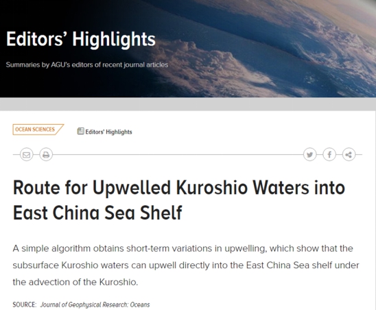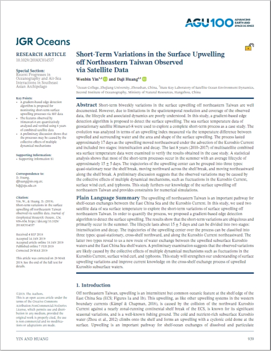 海洋科学系2019年新引进的青年副教授尹文彬博士收到美国地球物理学会(AGU)旗下海洋科学领域国际知名期刊《地球物理研究:海洋学》(Journal of Geophysical Research: Oceans)发来的贺信,祝贺他作为第一作者发表在JGR-Oceans上的研究论文“基于遥感观测的台湾东北部表层上升流短周期变化过程”(Short‐Term Variations in the Surface Upwelling off Northeastern Taiwan Observed via Satellite Data)成为了2018-2019热门下载论文(Top Downloaded Paper 2018-2019),下载次数名列前10%。该论文发表于2019年1月份,当期被编辑部评选为亮点论文(Editors' Highlight)并在AGU网站进行了推荐,北京大学海洋研究院、自然资源部第二海洋研究所卫星海洋环境动力学国家重点实验室、浙江大学海洋学院等国内海洋研究机构也先后发文对论文成果进行了报道。论文通讯作者为其博士生导师,原自然资源部第二海洋研究所副所长、现自然资源部第四海洋研究所所长黄大吉研究员。