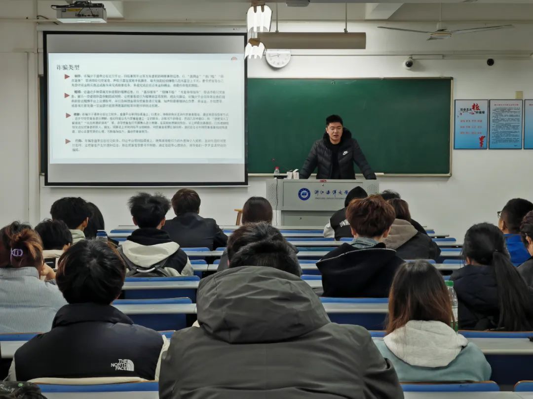 学院党委副书记胡金保结合具体案例,尤其是发生在同学身边的事件,以通俗易懂、生动形象地方式,向大家讲述网络电信诈骗的主要形式及其危害,进一步增强大家防范网络电信诈骗的意识和能力。同时,胡金保向各位同学进行了国家安全方面的教育,他提醒同学们舟山是我国重要的军事重地,有众多的港口、军事基地、舰艇等,大家要擦亮眼睛,进一步提高防范意识,要坚决抵制网络间谍抛出的诱惑,为维护国家安全、维护海洋军事安全做出应有贡献。
