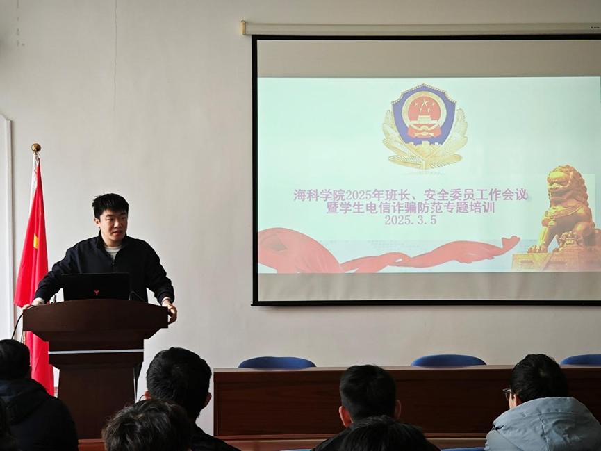 为进一步提升学生安全意识,筑牢校园安全防线,海科学院于3月5日、12日分别在长峙校区和定海校区召开班长、安全委员工作会议暨防范电信网络诈骗专题培训会。学院党委副书记胡金保出席会议并讲话,全体本科及研究生班长、安全委员参会,会议由辅导员孙瑞磐主持。