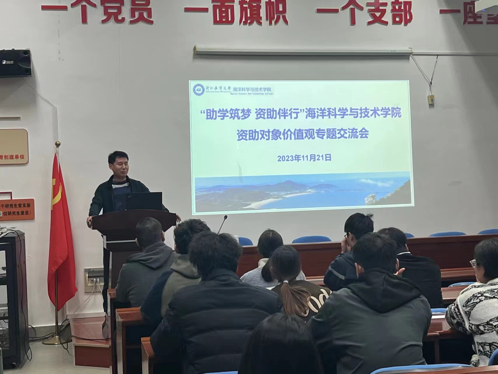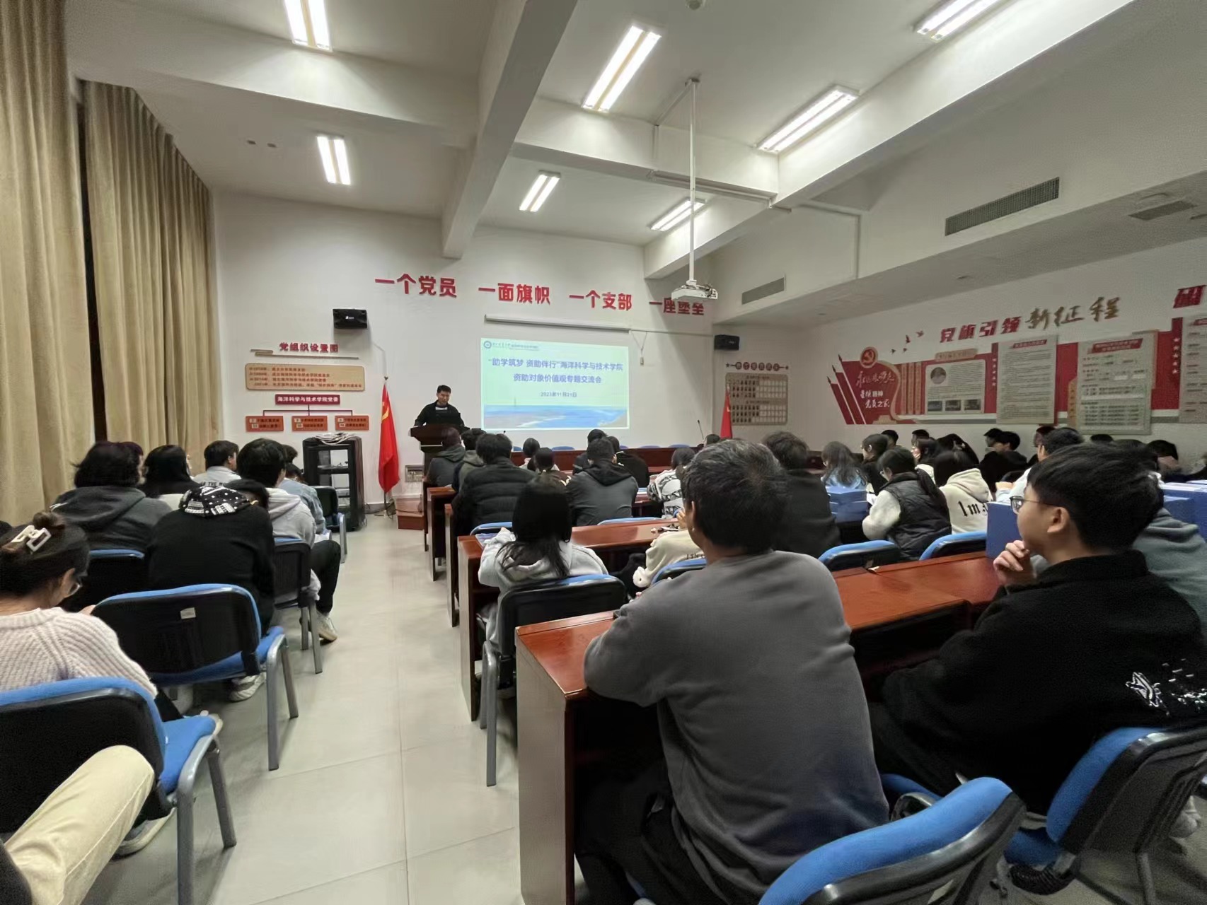 于11月21日晚上在海科楼141召开资助对象价值观专题交流会,辅导员菅康康主讲。