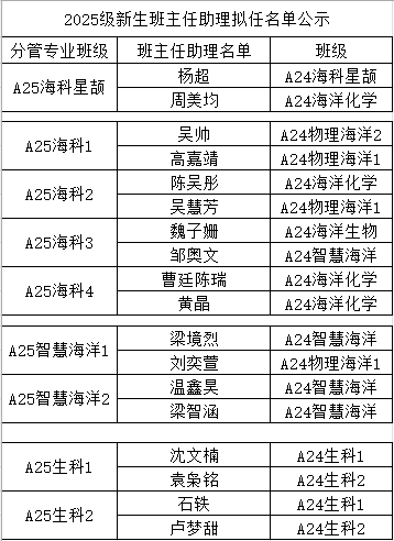 经公开招募、个人申报、面试选拔等环节,现公布海科学院2025级新生班主任助理拟录取名单如下: