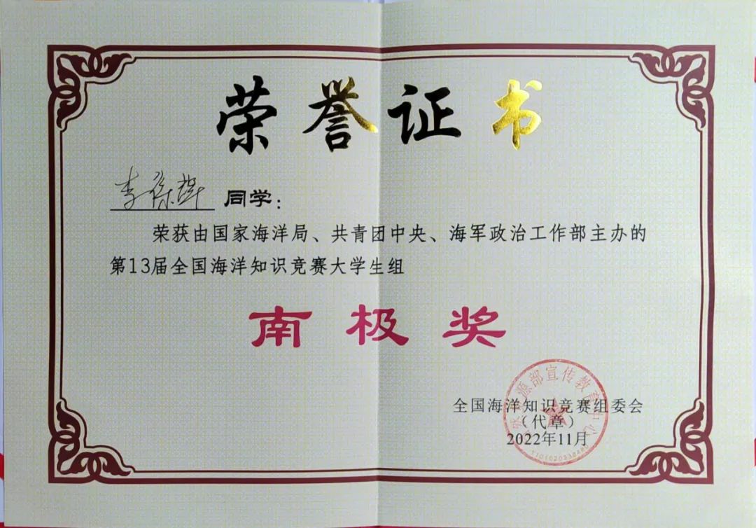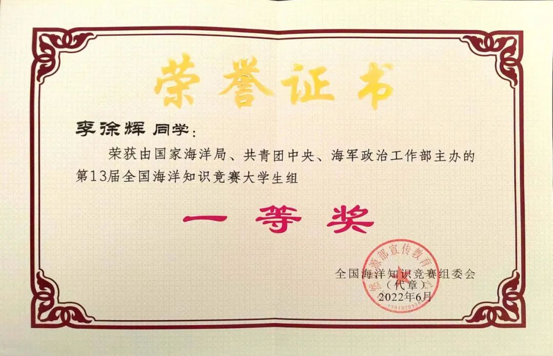 自2021年6月8日启动以来,全国1080所高校的大学生以及684.9万人次的公众参与了本届赛事,参赛人数创历史新高。在学院领导的悉心指导和大力支持下,李徐辉先后通过校赛、省赛的层层比拼选拔,脱颖而出进军第十三届全国大学生海洋知识竞赛决赛。