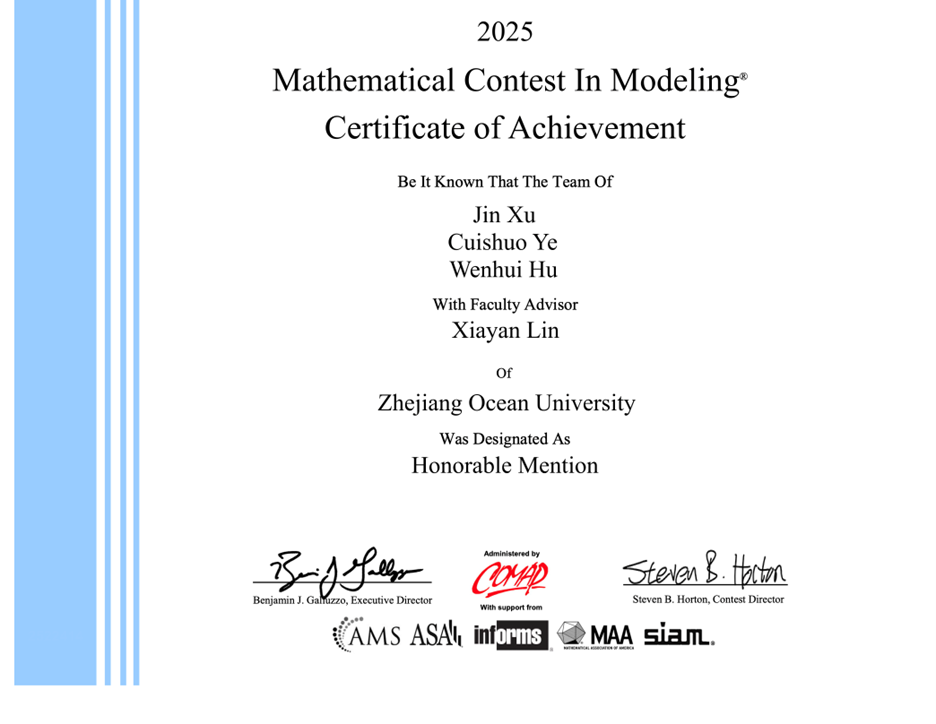 近日,2025年美国(国际)大学生数学建模竞赛(ICM/MCM)成绩揭晓。海科学院组织的参赛队伍喜获Honorable Mention奖(国际二等奖)2项,成功参赛奖(Successfully Participation)14项。其中,由丁文祥老师指导的朱好(队长)、宋彤彤、陈昱筱团队,以及林夏艳老师指导的许进(队长)、叶萃硕、胡雯慧团队摘得Honorable Mention奖。