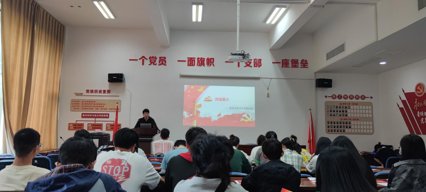 会上,A19海环鲁斐耀和A19物海樊龙俊,给20级的党员分享了自身的考研心得,两位党员今年分别考上了自然资源部第一研究所和第二研究所。鲁斐耀说,考研是一场持久战,要劳逸结合,身体是学习的本钱,没有一个好的身体,再大的能耐也无法发挥,他建议20级学生在备战考研的同时,制定适量的运动计划,调整好状态。樊龙俊说,考研首先要明确目标,选择适合自己水平的学校,在确定目标院校后要做到坚持,将大目标化解为小问题,将大战场切割成小战场,逐个击破。