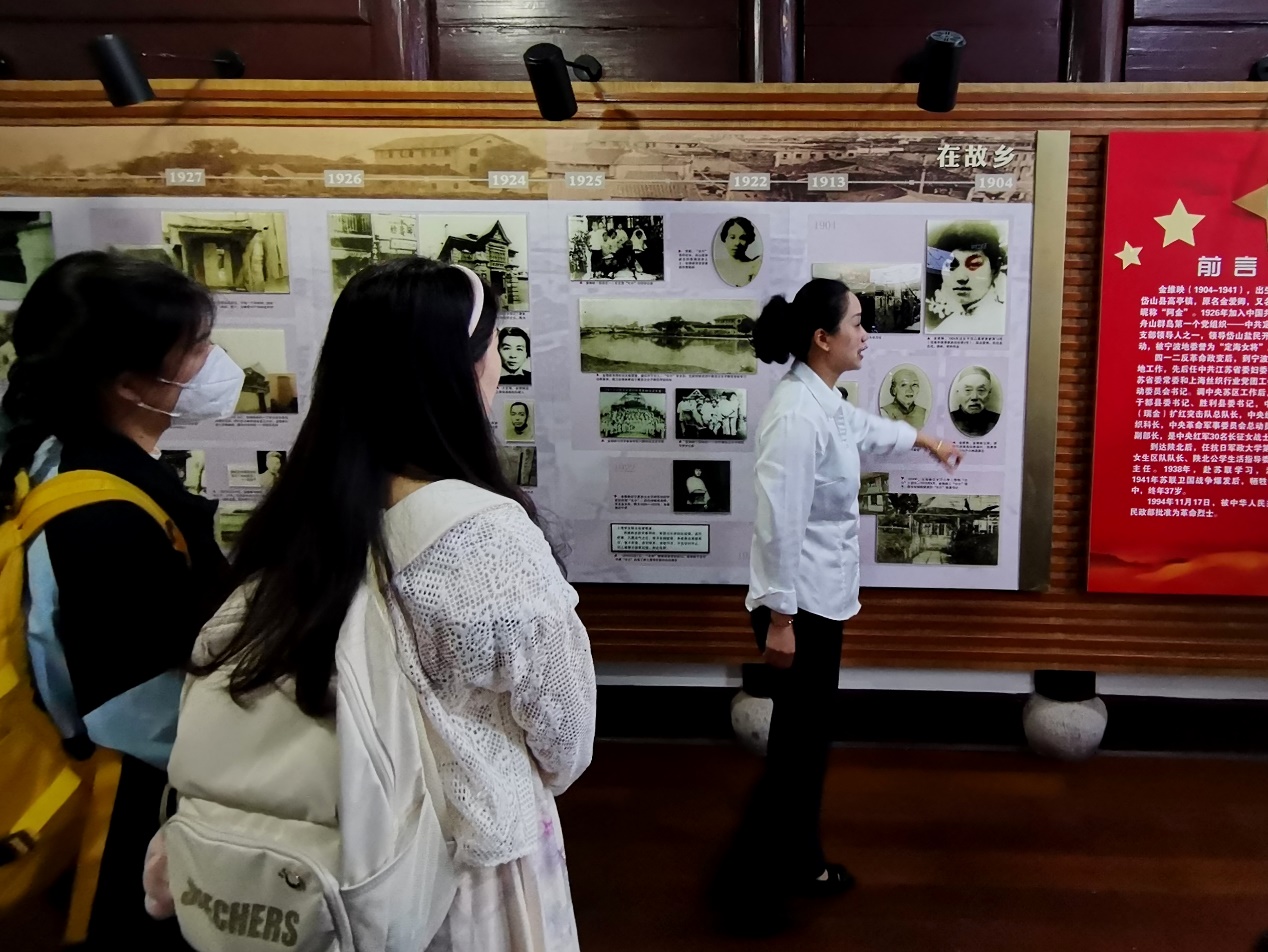 循着一条长长的弄堂,一行人来到灰瓦白墙朱红门窗的故居,抬头望去,江泽民同志题写的“金维映故居”赫然在目。金维映是舟山群岛的第一批共产党员,中共定海县独立支部的发起人之一,发动万名盐民运动,中央红军走完长征的30位女红军之一。掀开岁月的帷幕,这位被誉为“定海女将”的杰出女革命家,为中华民族的独立和解放、为新中国的诞生,贡献出了自己的一切。她传奇的一生,也见证着中国共产党从无到有、从胜利走向胜利的历程。