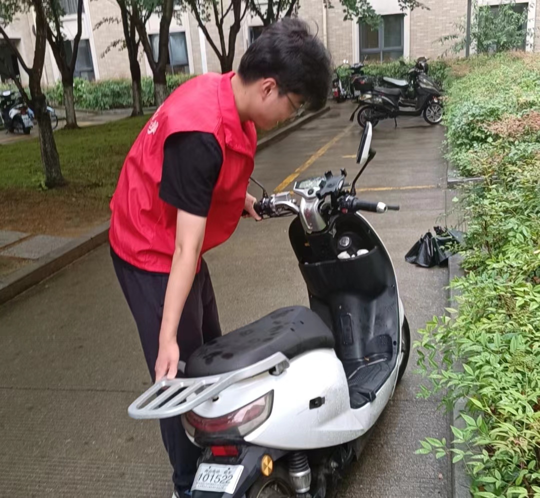 针对宿舍生活区电动车、自行车乱停乱放及部分垃圾乱丢的现象,党员志愿者们对宿舍环境进行分组打扫清理。尽管正值梅雨季节,支部党员们仍然在蒙蒙细雨中热火朝天进行宣传,将乱停乱放的电动车、自行车摆放至正确位置,清理校园宿舍区周围的不文明、不安全的现象。为建设安全、整洁、有序的校园环境贡献自己的绵薄之力!