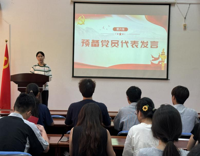 本科生第二党支部喻忠林代表预备党员发言,她表示将不忘初心,牢记使命,积极为党的事业贡献力量。