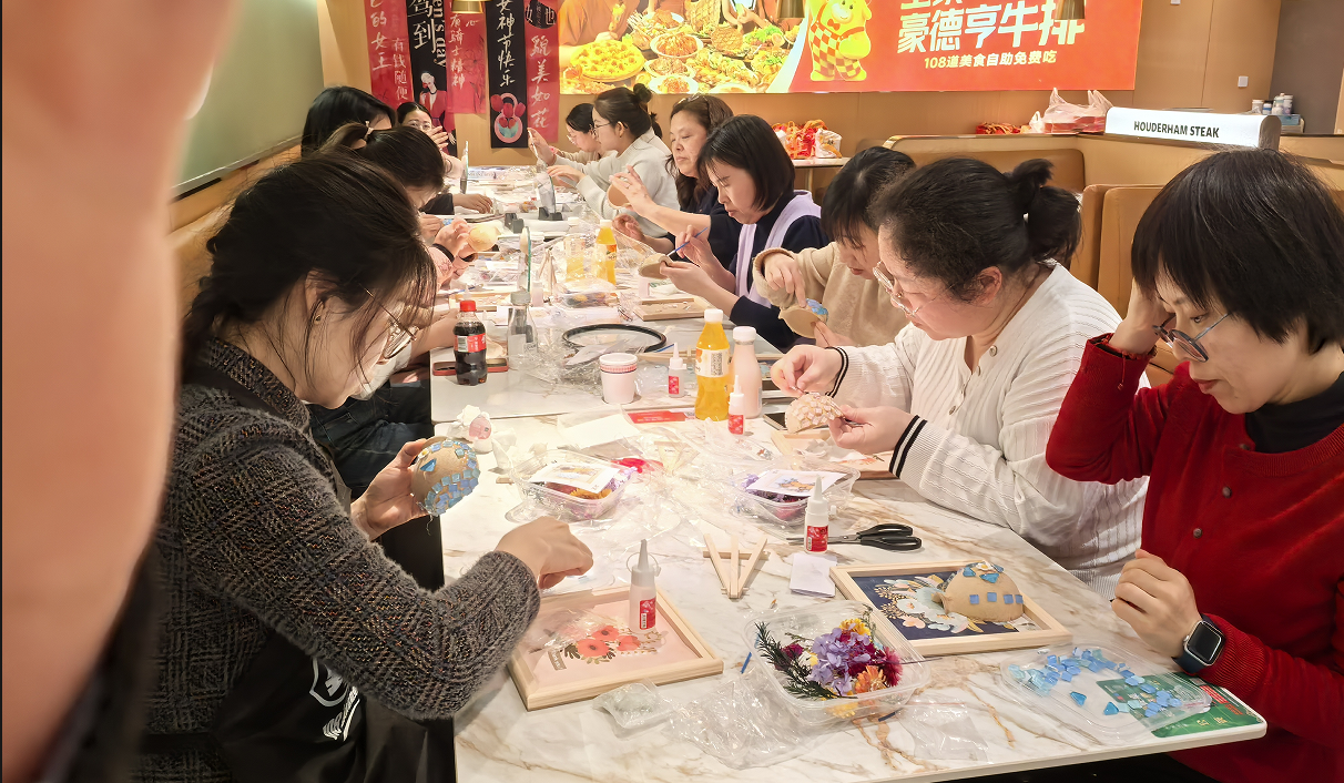 干花手作区,长桌上错落摆放着温暖的太阳花、淡雅的玫瑰、灵动的满天星与古朴的尤加利叶等干花材料。女教师们以相框为画布,用花材作笔墨",一个个化身艺术创作者,轻夹花瓣调整角度,细致点缀满天星,将春日意象定格于方寸之间。每一片花瓣都是时间的琥珀,这些干花就像我们的科研事业,经过沉淀反而绽放出更持久的生命力。