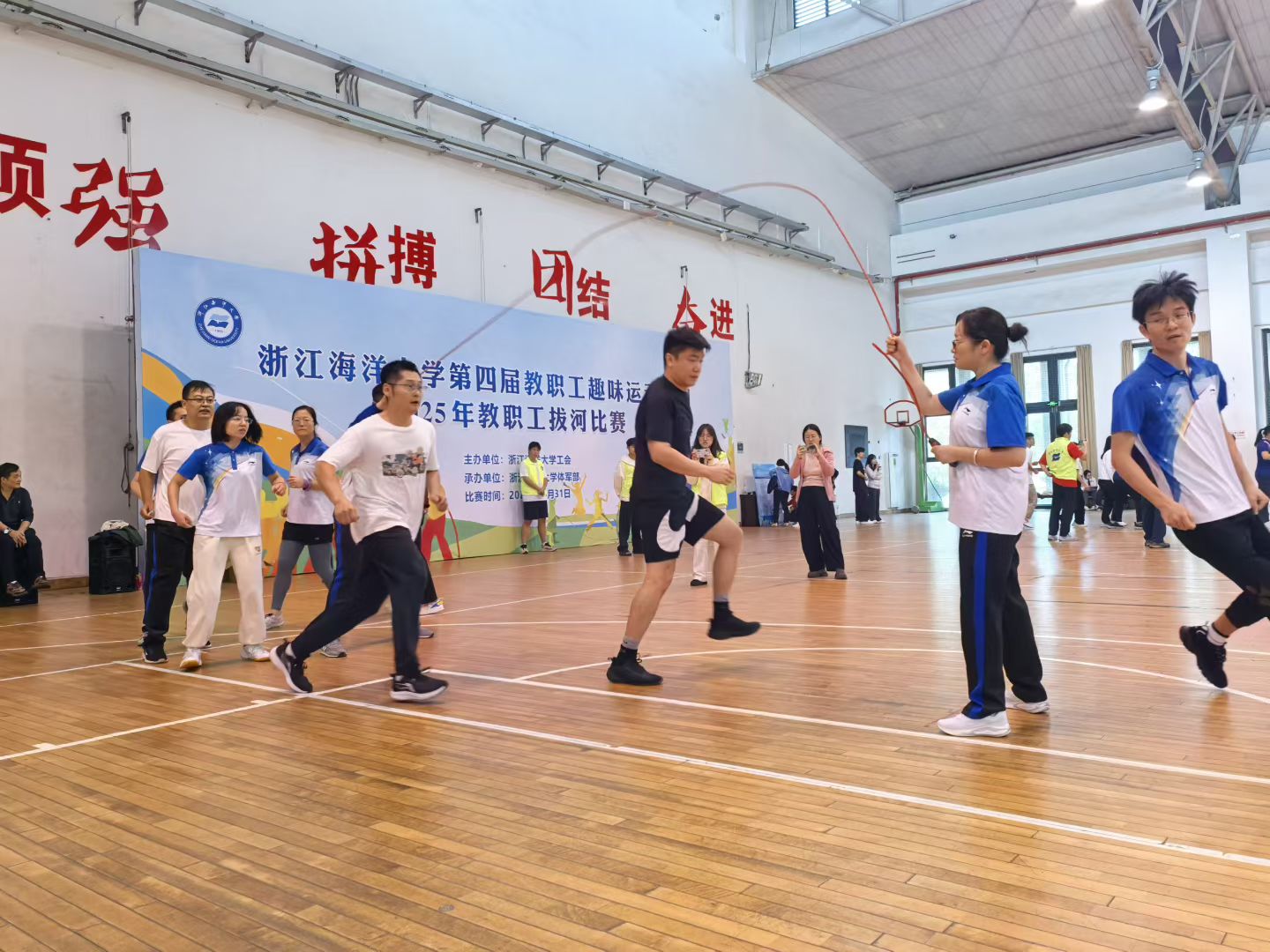 运动场上,平日里耕耘于教学科研一线和管理岗的教师们,化身活力四射的运动健将。他们在妙趣横生又充满挑战的比赛中通力合作,尤其在“四人接力踢毽子”、“8字跳绳”和“鼓动人心” 这三个极具协作难度的集体项目中,他们技压群芳,一举将三项冠军全部揽入怀中,成为赛场上一道引人注目的风景线。