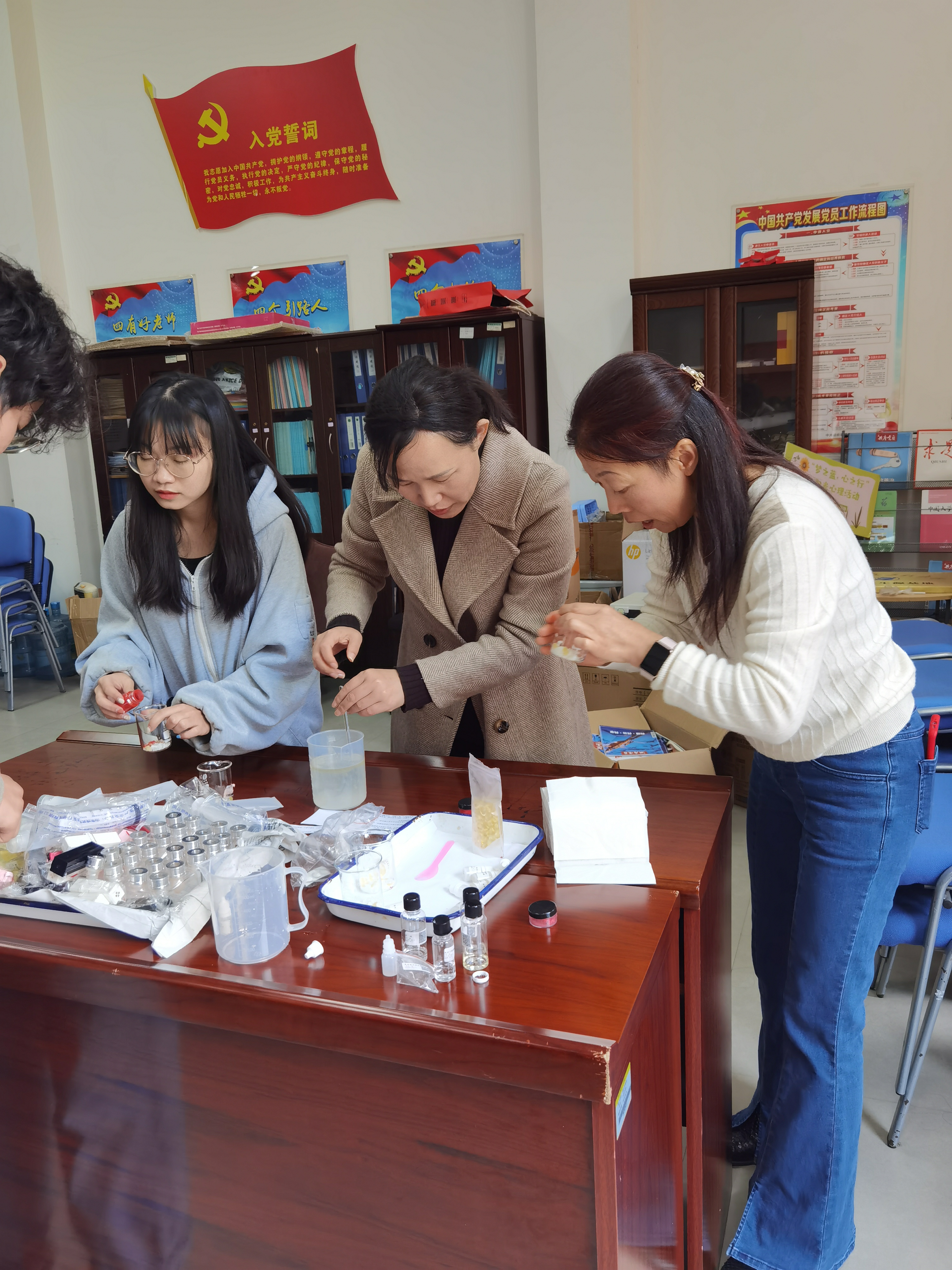 活动开始,老师们认真学习了护手霜、口红、口脂的制作方法及操作注意事项,之后6人一组,互帮互助、有条不紊地进行消毒、混合、加热、倒膜等操作,最终呈现出精美的作品。