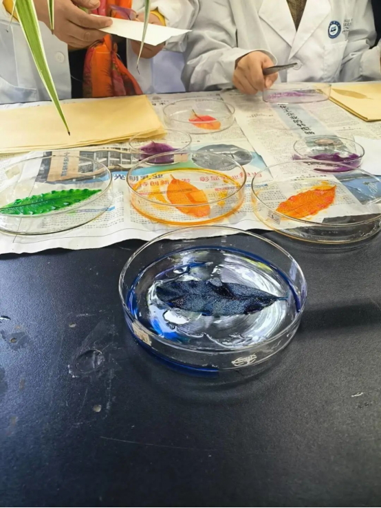 接着,同学们在老师的指导下有条不紊地开始了洗叶片、配置溶液、加热、清洗、刷洗、漂白、清洗等步骤。通过实验试剂腐蚀叶肉,再用牙刷刷除叶肉,留下的就是一张完整的叶脉了。