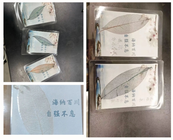 最后,为了能够更久地保存书签,同学们进行了最后一个步骤——塑封。在便签上写上叶脉品名、制作人姓名以及制作日期,将叶脉放在上面,送进塑封机,便得到了独属于自己、独属于这个秋日的精美书签。