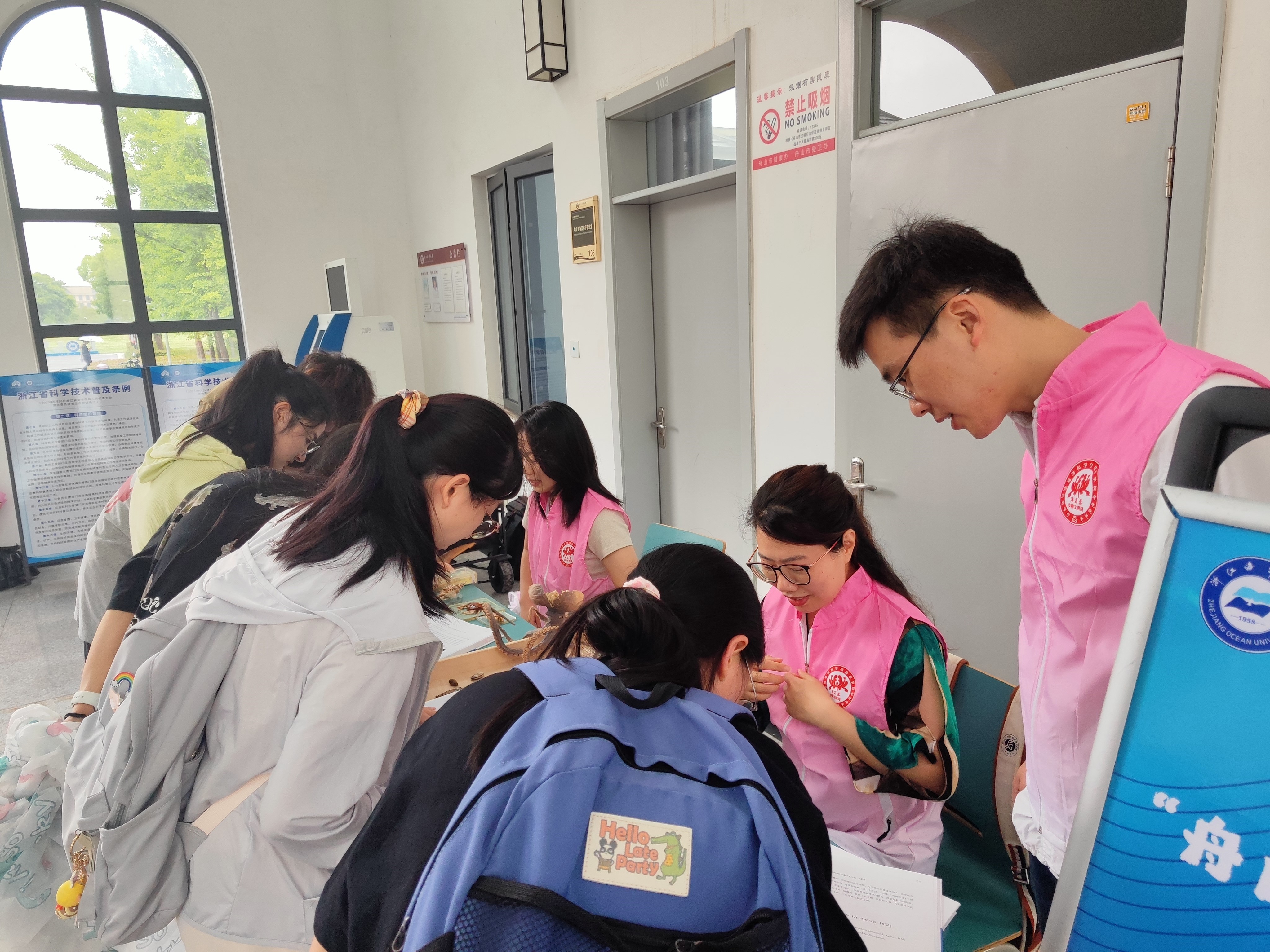 海洋生物博物馆的最新著作成果--《舟山群岛海洋生物多样性研究丛书》,同时也向师生们宣传了舟山群岛的鱼类、贝类、虾蟹类、藻类以及其他无脊椎动物等5大类群海洋生物多样性基础知识,并以生动有趣的互动形式吸引了师生们的驻足。