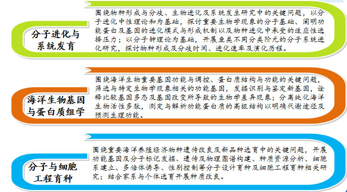 海洋生物资源与分子工程实验室依托浙江省重点学科(生物化学与分子生物学)、省重点专业(生物科学)和生物学省级实验教学示范中心,紧紧围绕海洋生物遗传进化的基础理论和资源开发的关键技术,根据研究方向不同,下设海洋生物种质资源与工程育种、鱼类分子遗传与免疫进化、海洋生物蛋白质工程、海洋微生物生态与应用等四个研究分室。实验室的定位是:瞄准生物科学前沿,注重学科交叉,加强基础理论和应用技术结合,突出海洋特色。