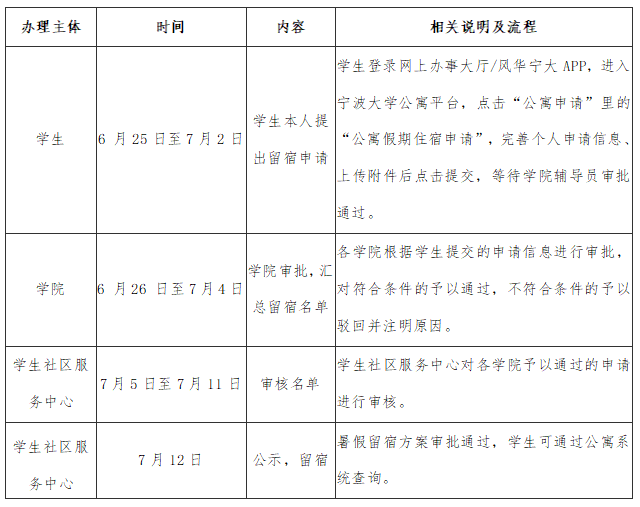 2.暑假留宿申请将采用线上申请的形式。申请流程如下:学生打印并填写《宁波大学暑假学生住宿申请表》→学院审核并签字→学生登录网上办事大厅/风华宁大APP→进入“宁波大学公寓”平台→点击公寓申请→新增“公寓假期住宿申请”→填写申请信息、上传附件《宁波大学暑假学生住宿申请表》→提交申请。(申请表需由班主任(研究生导师)、辅导员、各学院分管学院工作的负责人签字确认,没有签字视为不同意留宿)。具体工作安排如下表: