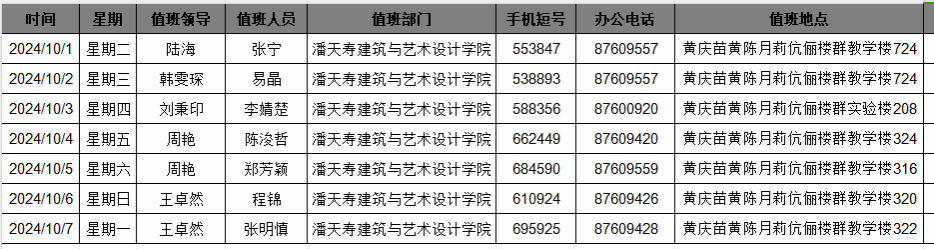 四、严格校园管理。学院结合实际,做好假期值班值守工作,会同大楼物业加强安全巡查,发现问题及时处置,并按有关程序做好信息报送工作,不得隐瞒不报或迟报、漏报,确保校园安全稳定。学院值班院领导、值班人员、地点、办公电话如下: