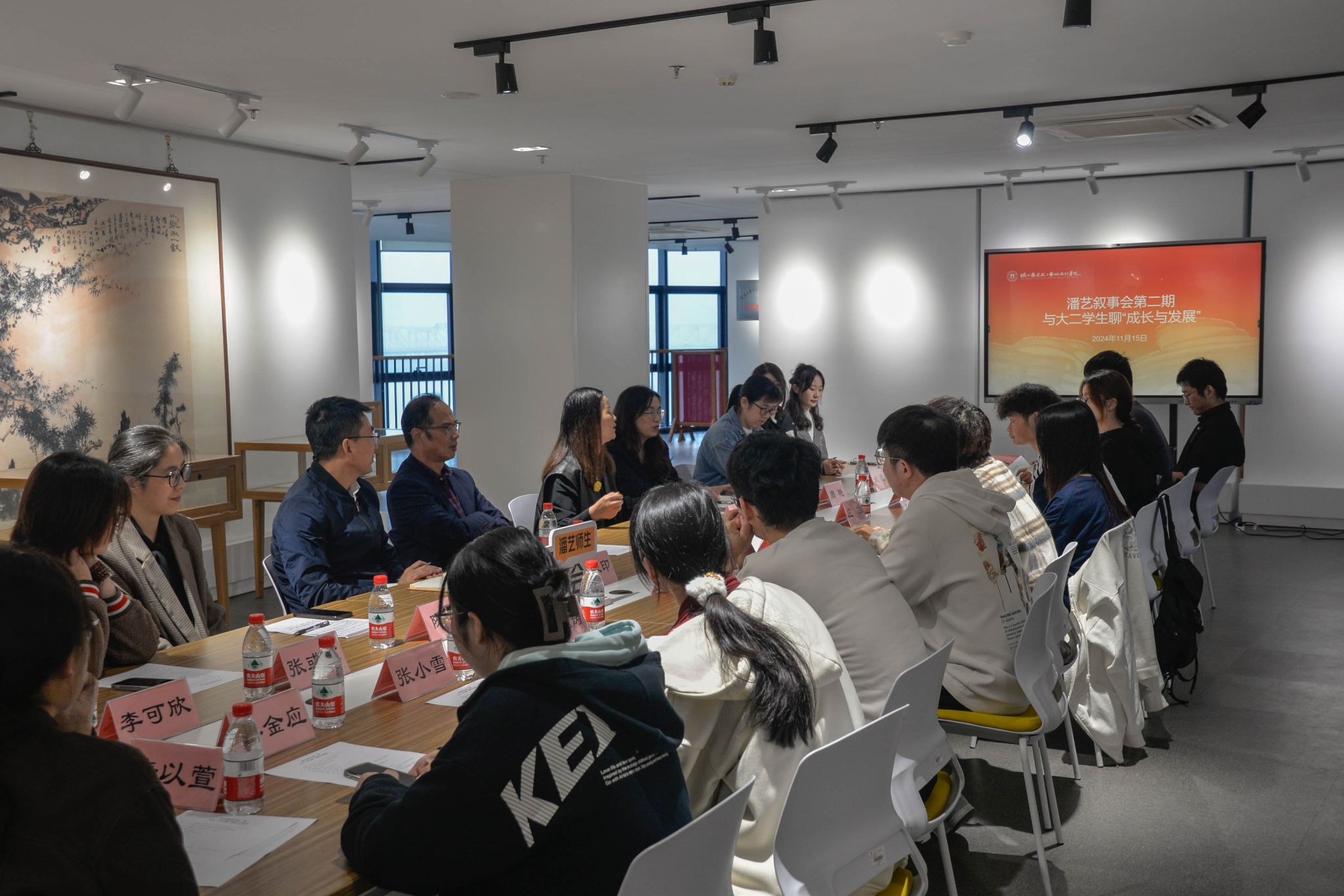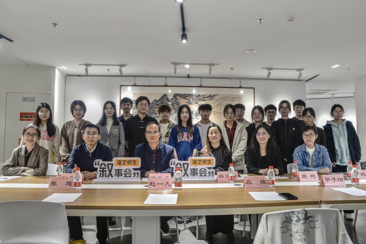 为进一步了解和掌握从阳明学院转入我院的2023级学生的学习、生活情况,帮助他们尽快适应专业学习,培养专业学习兴趣,找准职业发展方向。11月15日,学院在潘天寿艺术教育思想馆举办第二期“潘艺叙事会”,主题为:与大二学生聊成长与发展。学院学术委员会主任周至禹、党委书记韩雯琛、党委副书记刘秉印、副院长周艳、教务办主任姚艳、学工办主任陈颖以及2023级部分学生代表参加了此次活动。会议由学院党委书记韩雯琛主持。