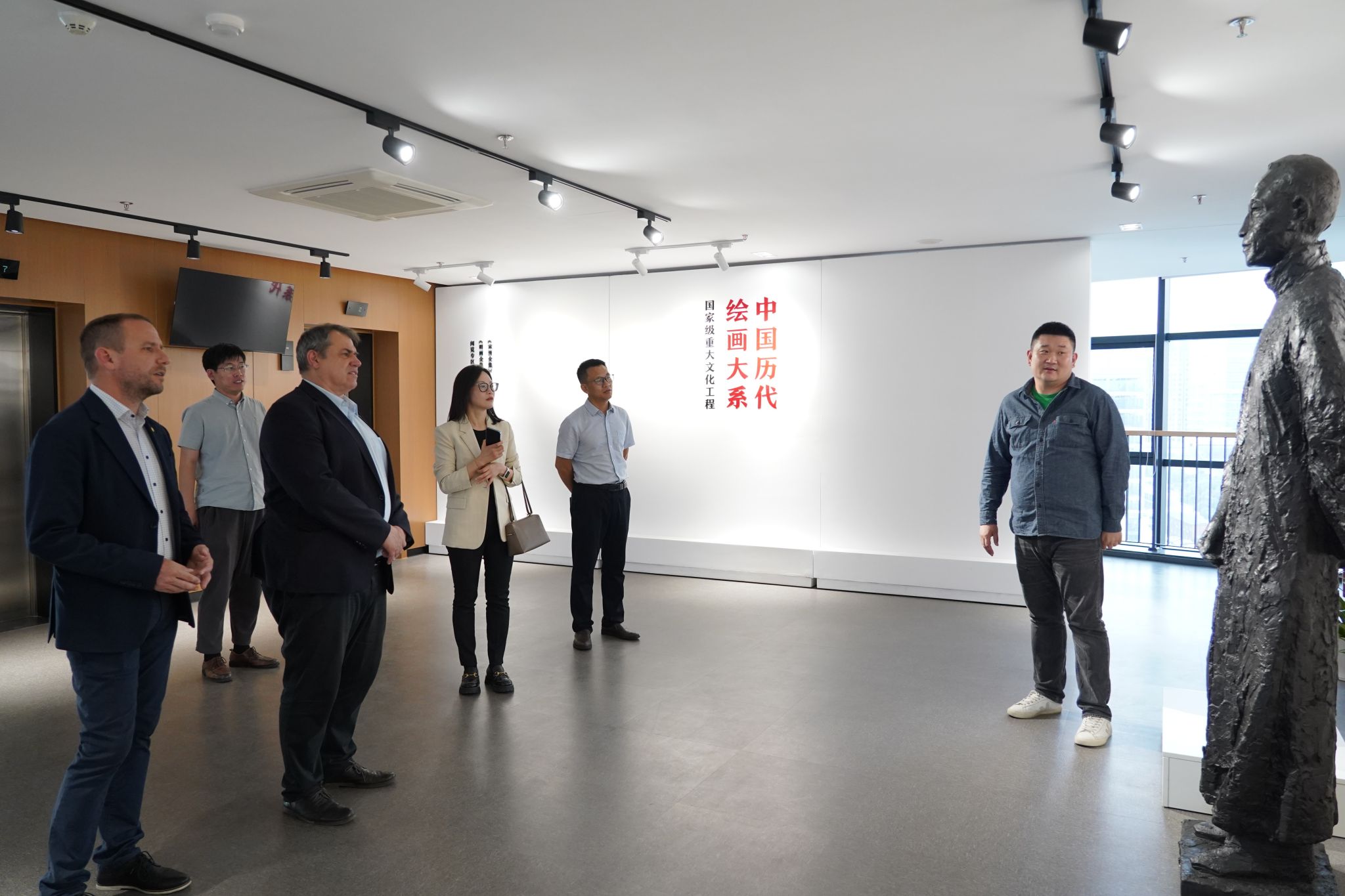 在王卓然副院长的陪同下,Hamar Imre副校长一行首先参观了位于学院9楼的潘天寿艺术教育思想馆。王院长向客人详细介绍了中国近现代艺术大师潘天寿先生的生平事迹、艺术成就及其教育理念,并重点讲解了馆内珍藏的潘天寿经典作品。代表团成员对潘天寿先生“中西融合、传承创新”的艺术思想表现出浓厚兴趣,并就中国书画艺术的独特魅力与王院长进行了交流。随后,代表团参观了学院收藏的《中国历代绘画大系》部分经典作品。Hamar Imre副校长高度赞赏这一国家级文化工程的价值,认为它不仅展现了中国传统绘画的博大精深,也为国际学者研究中华艺术提供了宝贵资源。Bartus David院长表示,罗兰大学文学院在东方文化研究领域有着深厚积累,期待未来能与我院在艺术史、文化遗产保护等方面开展联合研究。