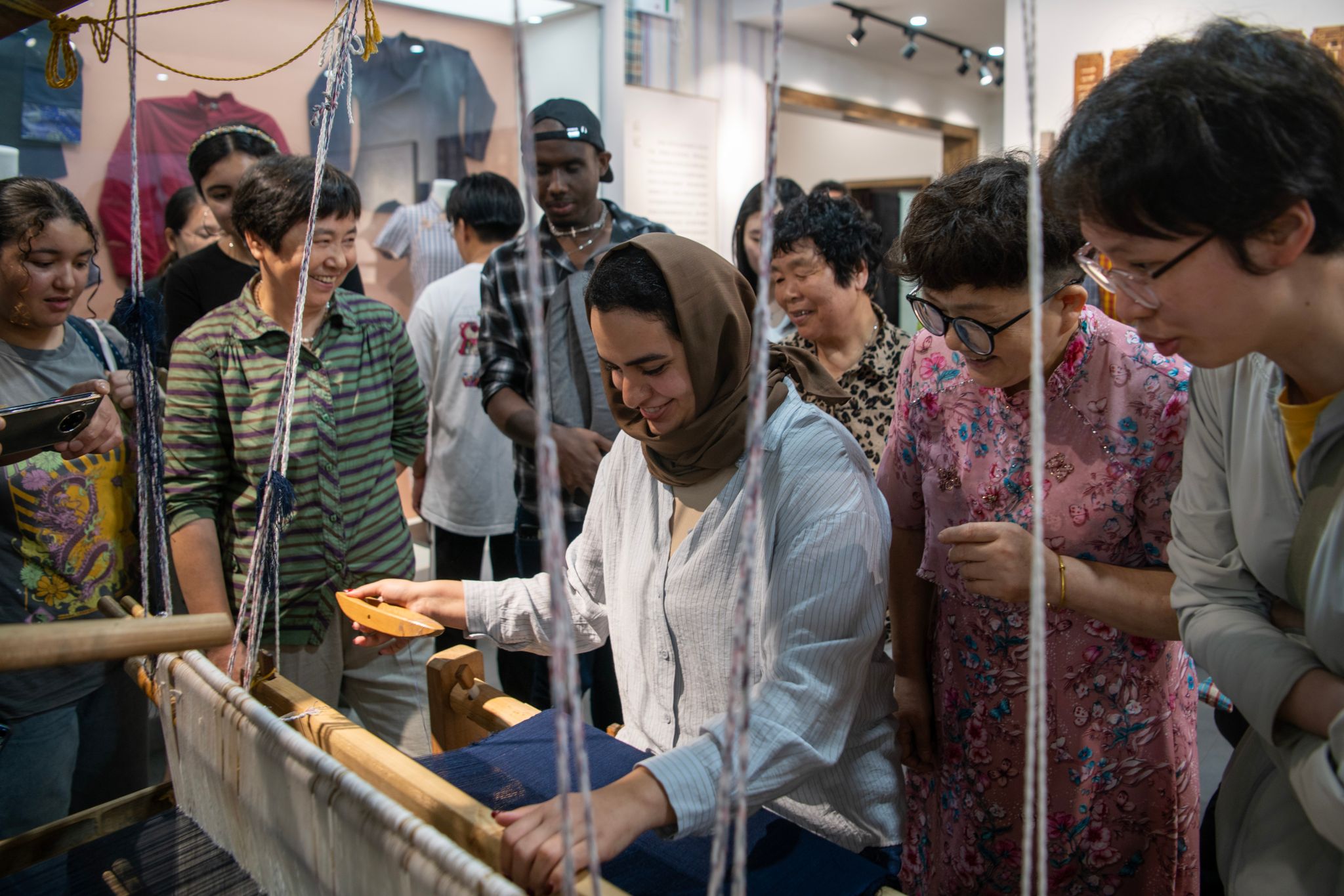 在土布展示馆织的织布梭机前,当地非遗传承人演示了“投梭打纬”的绝技。学生们也纷纷跟随着她的动作,亲手体验从棉线到土布的蜕变历程。