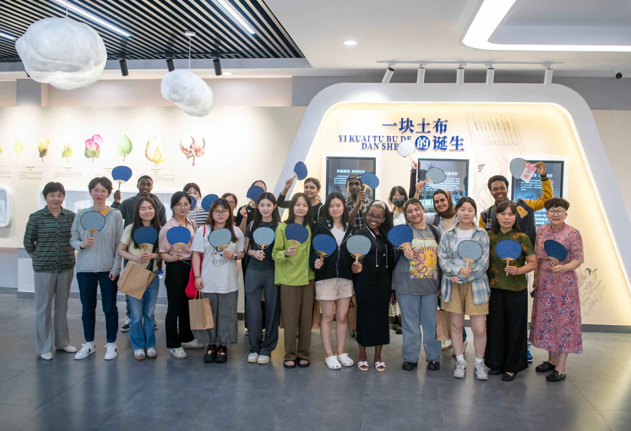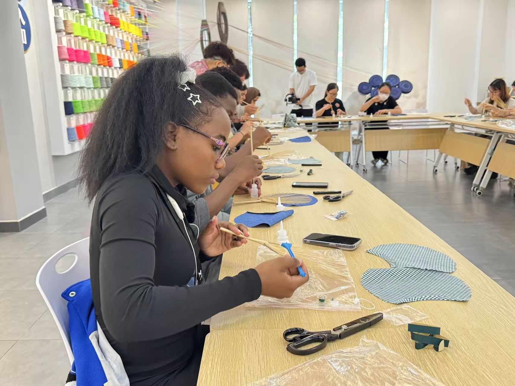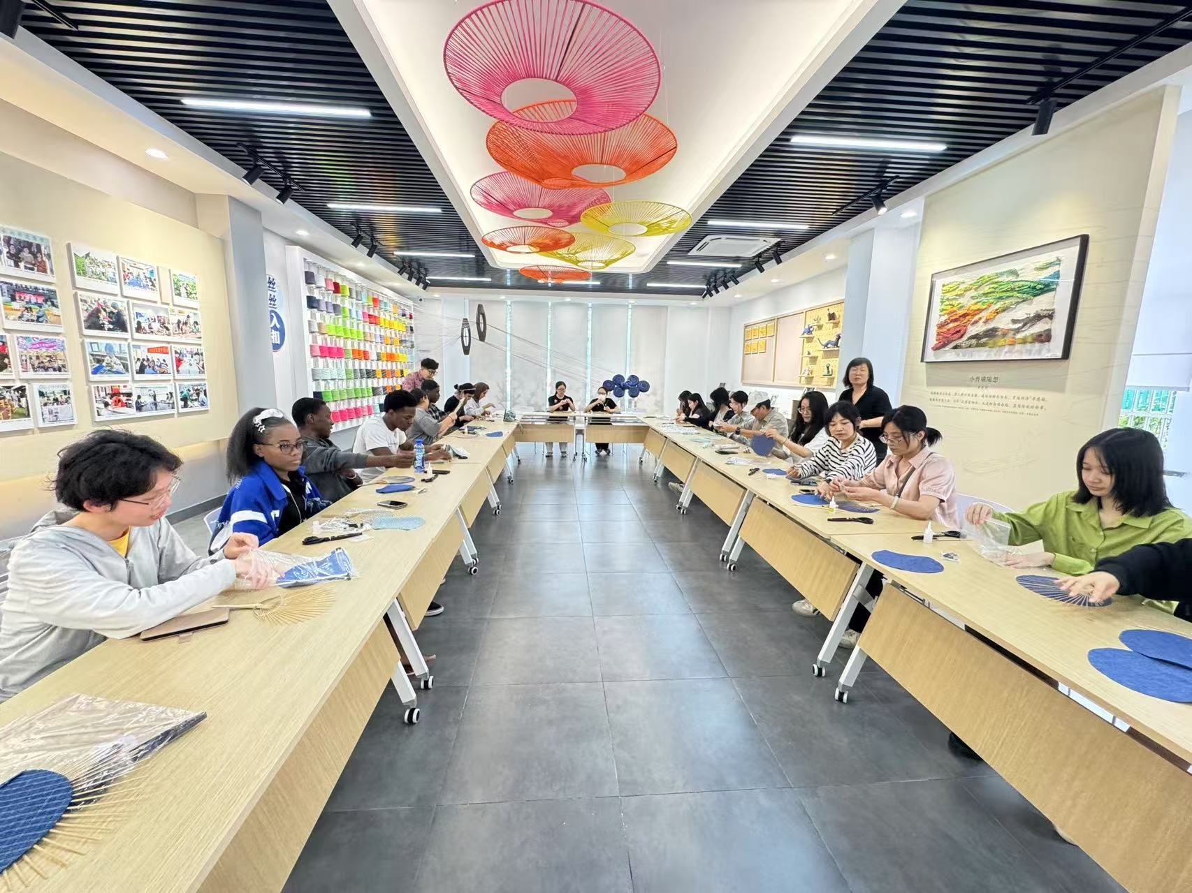同时,余姚土布展示馆也为宁大师生精心安排了一场非遗课堂,留、学生们饶有兴致地体验土布团扇制作,细密的经纬线在竹绷上交织。“这次活动让我感受到了中国传统手工艺的精妙,我很高兴能亲手制作一件属于自己的非遗作品!”一位留学生兴奋地表示。