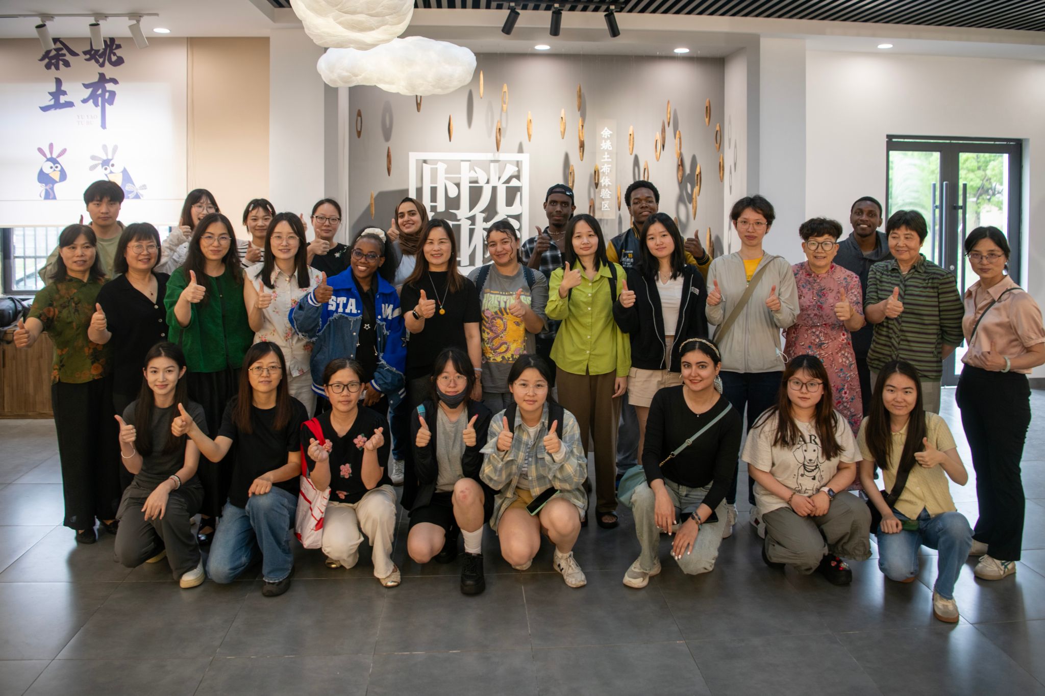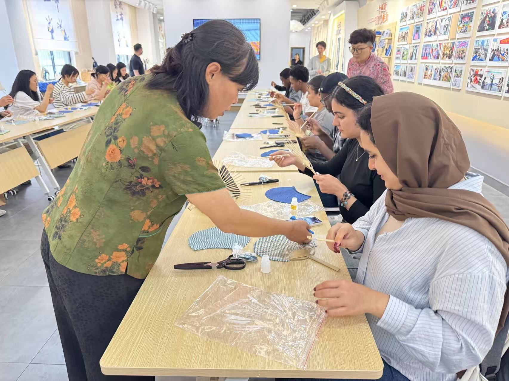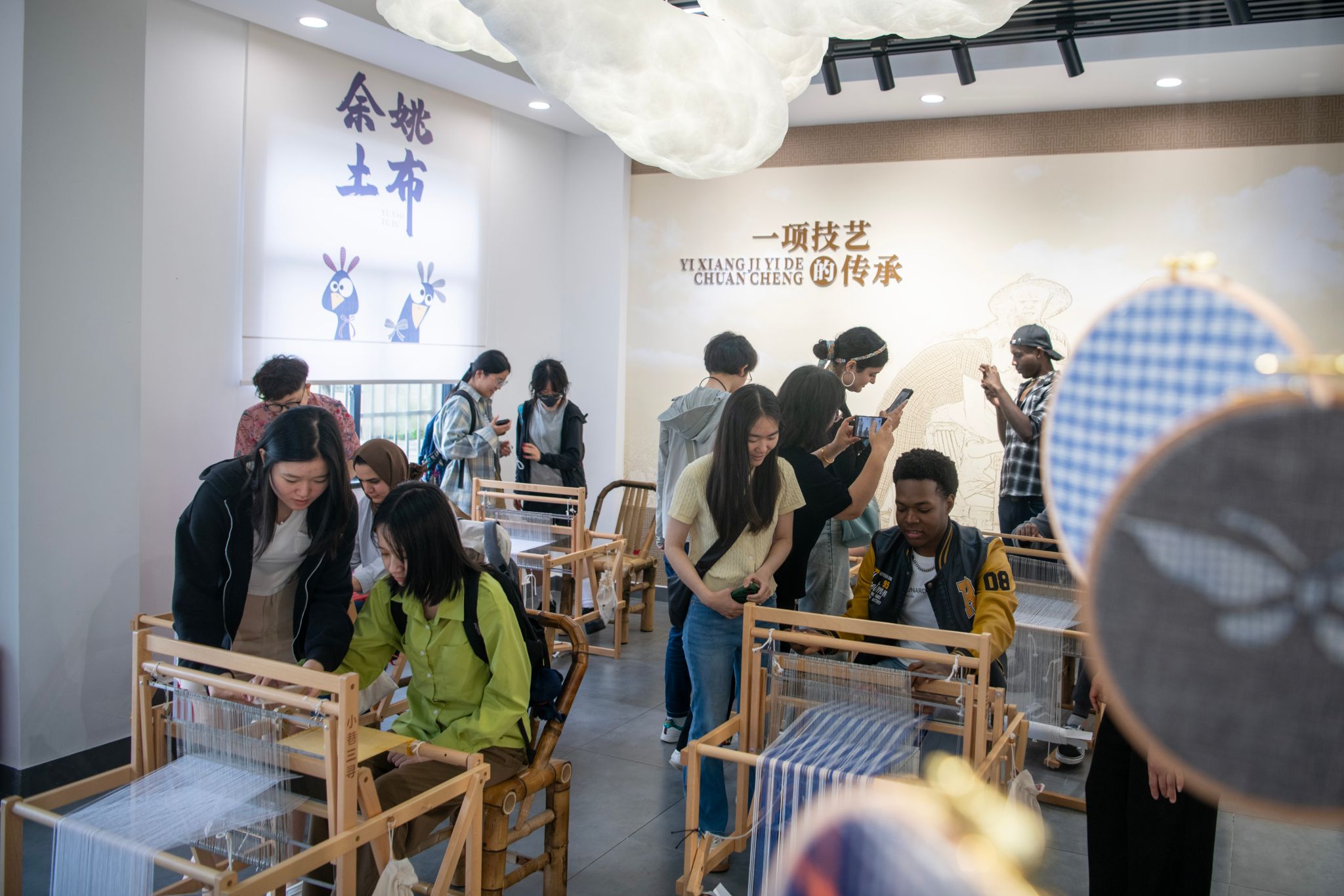 同时,余姚土布展示馆也为宁大师生精心安排了一场非遗课堂,留、学生们饶有兴致地体验土布团扇制作,细密的经纬线在竹绷上交织。“这次活动让我感受到了中国传统手工艺的精妙,我很高兴能亲手制作一件属于自己的非遗作品!”一位留学生兴奋地表示。